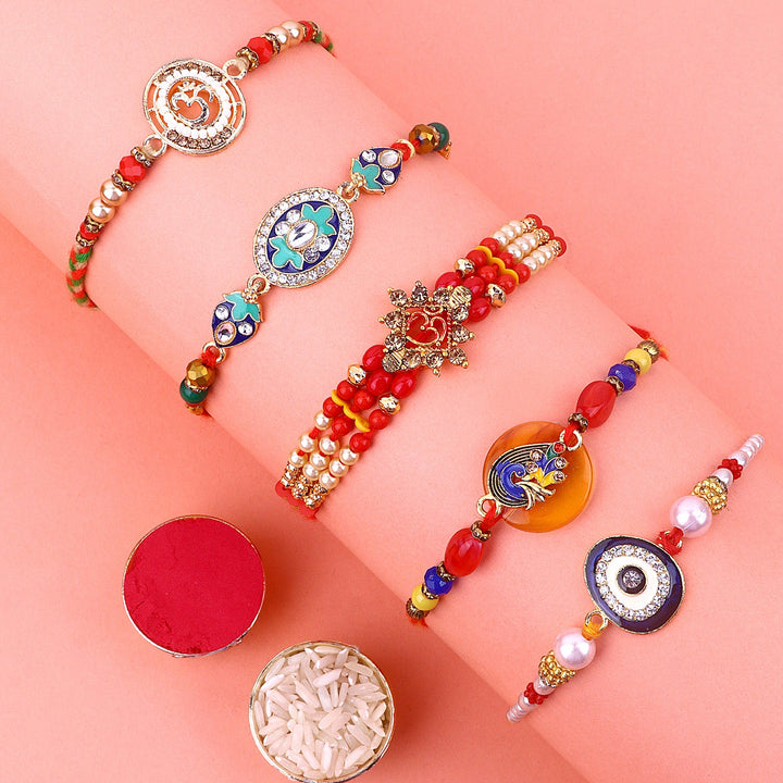 • About Product: Satvik Store Introducing this Assorted Designer Rakhi Set of 5 to make this occasion special. Each rakhi in this collection is a work of art, painstakingly made with elaborate designs and embellished with colorful ornaments. These designer rakhis are a fusion of tradition and modern elegance, with shimmering strands and brilliant stones. Each of the set's rakhis is a special representation of love and protection with a variety of patterns and motifs. Allow your brothers to experience the comfort of their affection by surprising them with this type of lovely collection. Making your celebration of Raksha Bandhan a special occasion by celebrating their bond via our Colourful Designer Rakhi Set of 5.