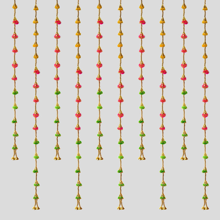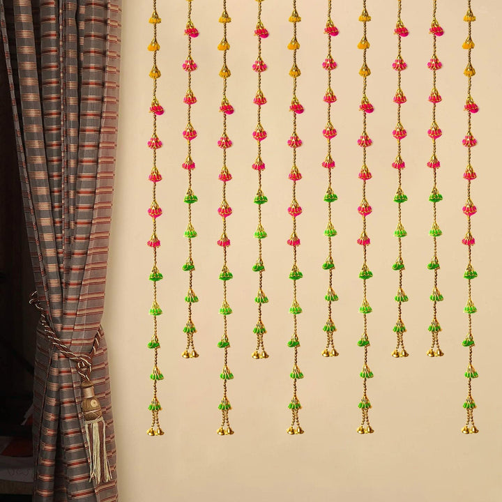 Add a playful and festive charm to your home décor with this Pom Pom Wall Hanging Backdrop featuring decorative bells. Crafted with colorful pom poms and jingling bells, this latkan is perfect for brightening walls, doorways, or windows during festivals, celebrations, and special occasions.