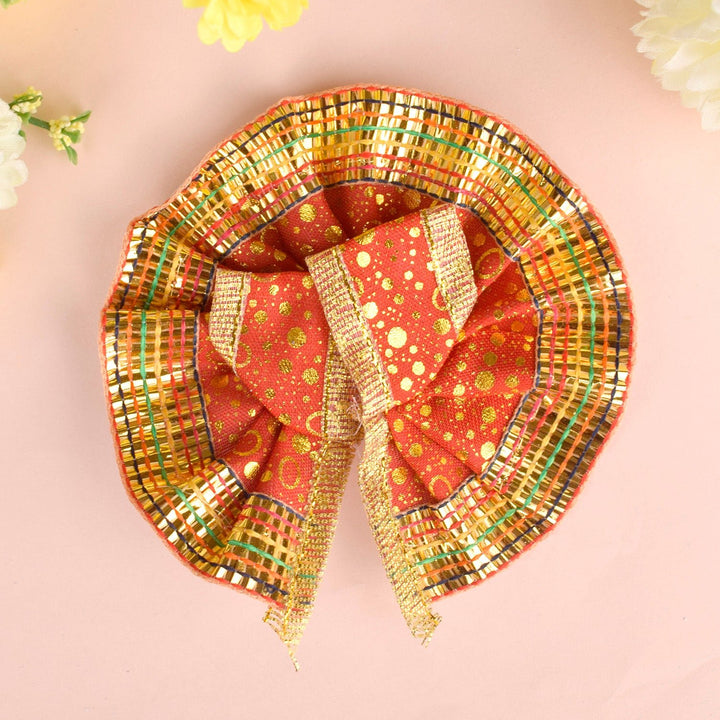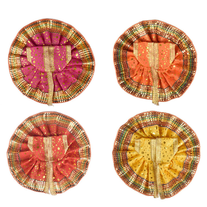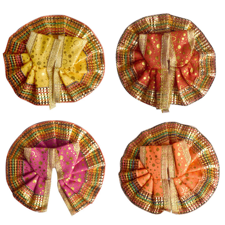 dotted laddu gopal dress | golden border krishna poshak | pink yellow red orange gopal dress | playful deity attire | vibrant laddu gopal clothes | festive pooja outfit | traditional bal gopal vastra | krishna ji dress online | dotted kanha ji dress | divine laddu gopal poshak | satvikworld.com