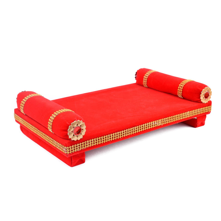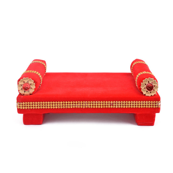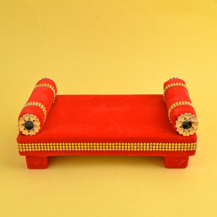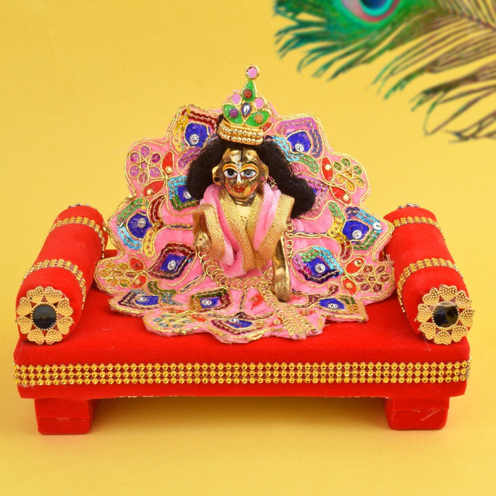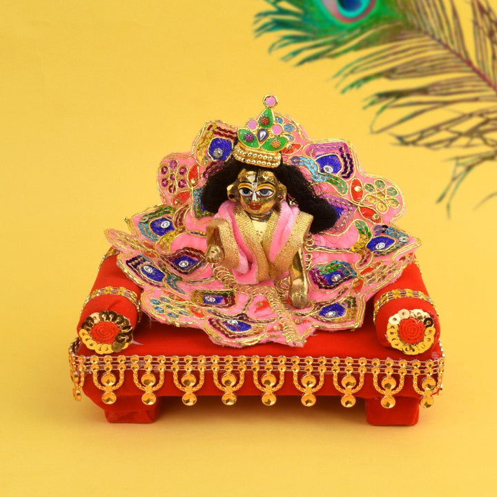 The plush surface offers comfort for the idol while enhancing the spiritual ambiance with its vibrant color and regal appeal. Whether for Janmashtami, daily pooja, or temple decor, this singhasan adds a sacred elegance and becomes the heart of your altar.