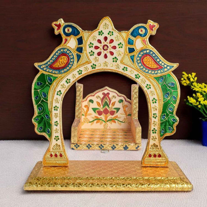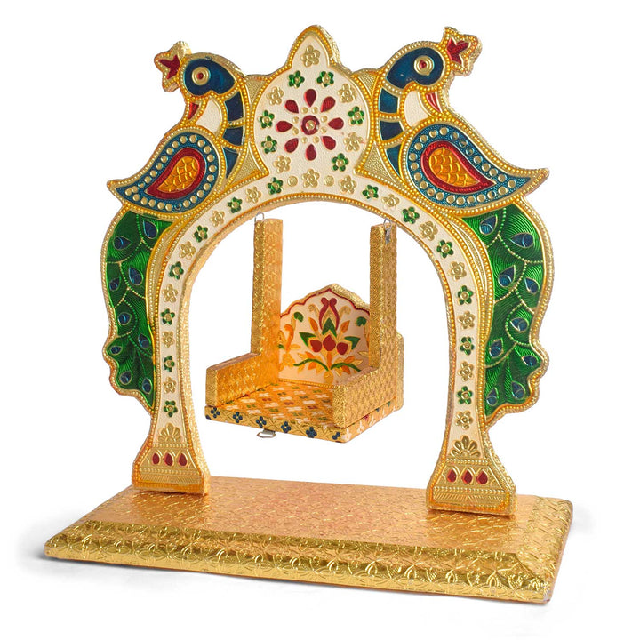 meenakari laddu gopal jhula | golden peacock krishna jhula | temple top swing for laddu gopal | big size krishna swing | pooja mandir jhula | satvikstore meenakari swing | gold tone kanha ji jhula | metal enamel swing for krishna | laddu gopal seat