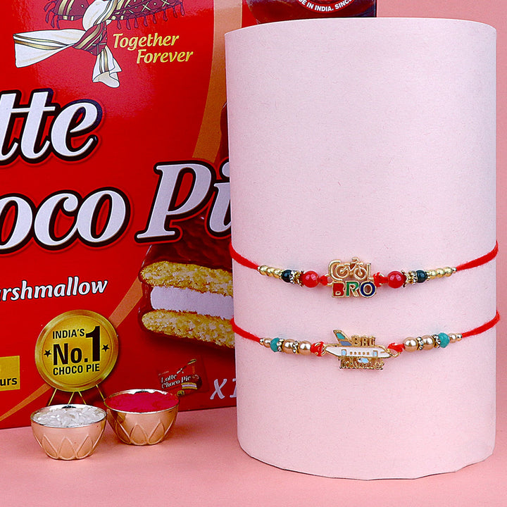 • Package: Set of 2 Bhaiya Rakhi, 1 Greeting card, 1 Roli Chawal Bottle, 1 Chocolate Pack