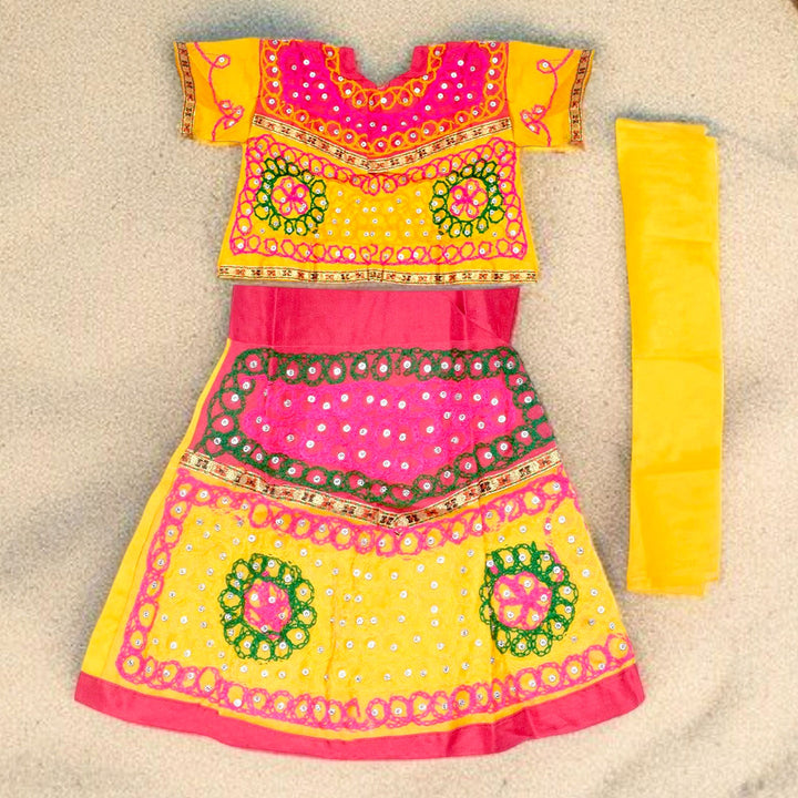 Let your little one radiate divine grace in this elegant Radha Dress, beautifully adorned with traditional Chikankari embroidery and delicate embellishments. Crafted in 100% pure cotton, the fabric is breathable and skin-friendly—perfect for festive days full of joy. Whether it's vibrant red, sunny orange, soothing blue, or soft pink, each color brings its own charm. Ideal for Janmashtami, school functions, pooja rituals, and cultural events, this lehenga set with dupatta is designed to embody elegance, tradition, and comfort for your little Radha Rani.