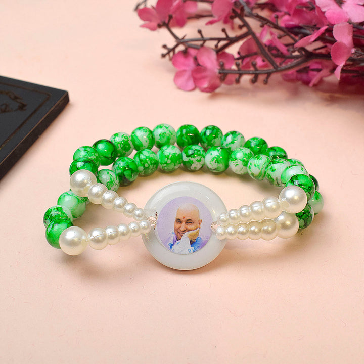 Crystal Green Beads Double Layer & White Pearl Bracelet with Jai Guruji Swaroop