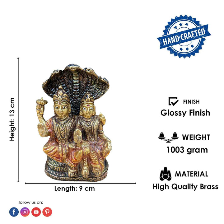 About Product: The 5 Inch Brass Vishnu Laxmi Idol is an elegantly crafted statue representing the divine union of Lord Vishnu and Goddess Lakshmi. Made from high-quality brass, this idol features intricate detailing and a polished golden finish, enhancing its beauty and spiritual significance. Lord Vishnu, the preserver of the universe, is depicted with his symbolic attributes, while Goddess Lakshmi, the goddess of wealth and prosperity, is shown with a serene and graceful expression. Together, they embody harmony, abundance, and divine protection. This 5-inch idol is perfect for home or temple decor, bringing a sense of peace, prosperity, and positive energy to any space.