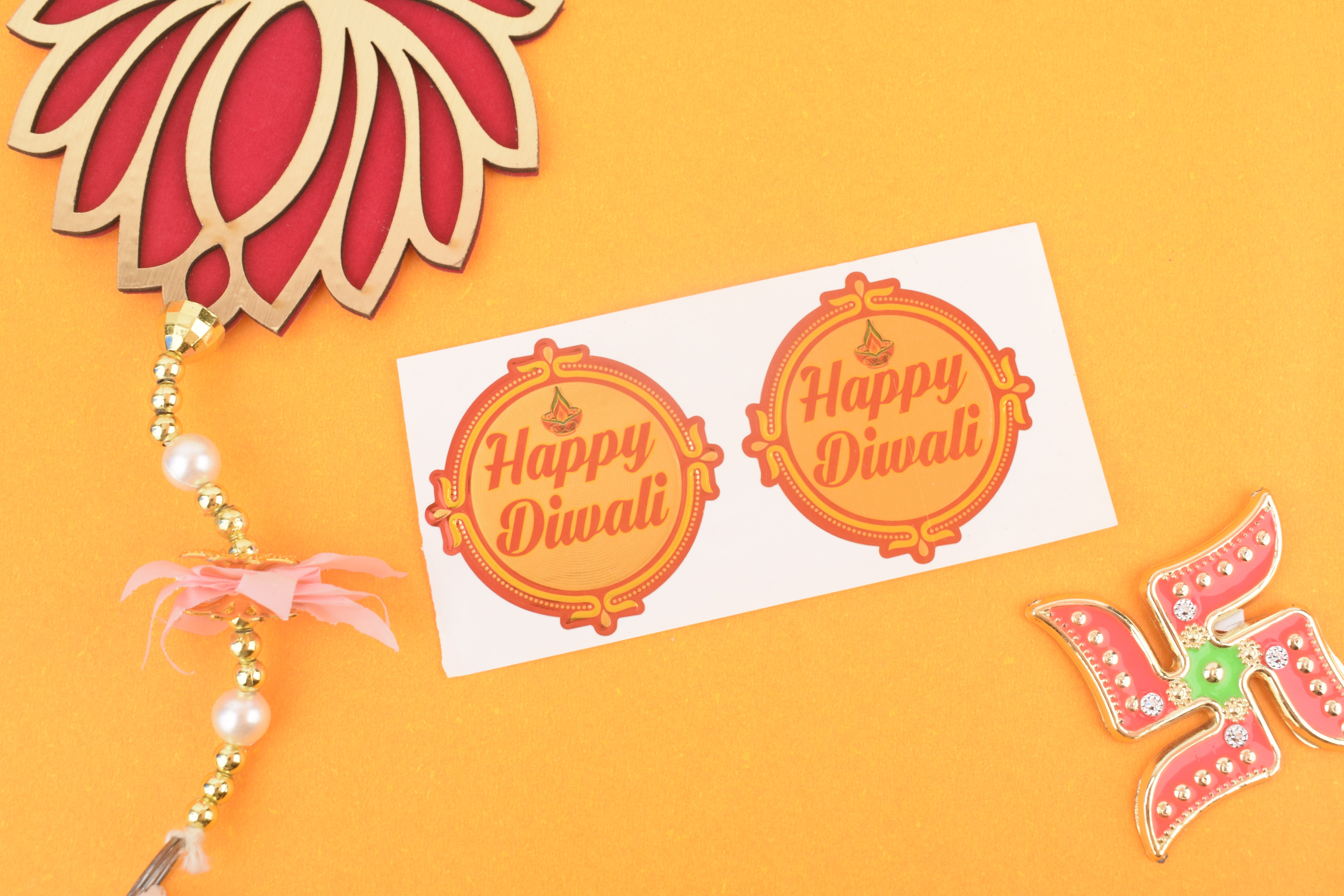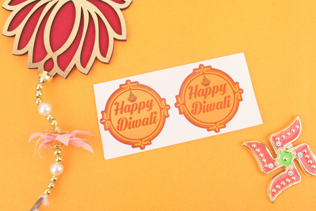 "Festive 'Happy Diwali' Sticker with Lanterns and Lights (Assorted) – Celebrate the Festival of Lights with this vibrant and joyful sticker design! Featuring the words 'Happy Diwali' surrounded by colorful lanterns, twinkling lights, and traditional festive elements, this sticker adds a warm, celebratory touch to any occasion. Perfect for decorating cards, gifts, or social media posts!"
