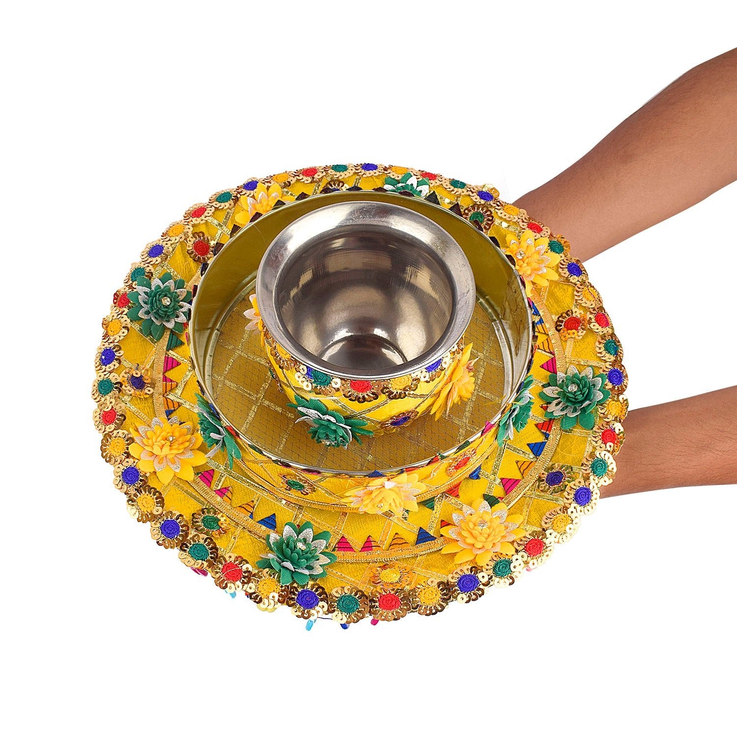Bright Yellow Karwa Chauth Thali Set|Buy at Satvikworld.com