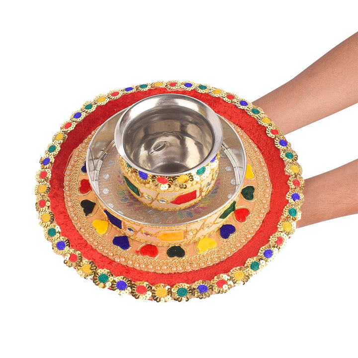 Item Name: Radiant Multicolor Karwa Chauth Thali Set- 3pc