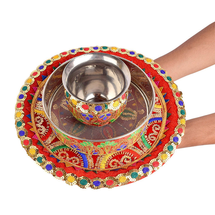 Vibrant Traditions Multicolor Karwa Chauth Thali Set - 3pc|satvikworld.com – Satvikworld.com