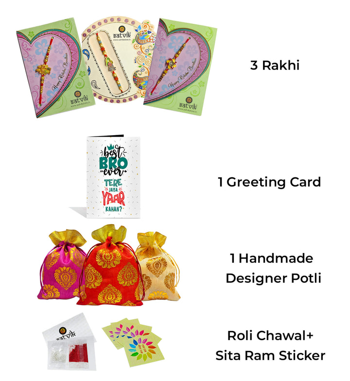 • Package: Set of 3 Rakhi with Tilak set ( Roli Chawal ) and Holy Soun ( Ram Sita Stickers).