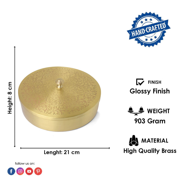 Elevate your Pooja room with this exquisite spice storage container featuring 7 compartments, crafted in pure brass. The traditional Indian Brass smithing techniques, coupled with intricate etching, add a touch of elegance. Each Brass box is handcrafted, ensuring a unique and distinct character with minor variations, making it a truly special addition to your sacred space. Upgrade your Pooja Ghar with this artisanal brass piece, blending functionality with timeless design.