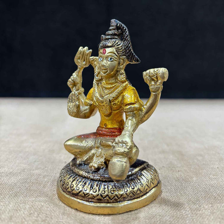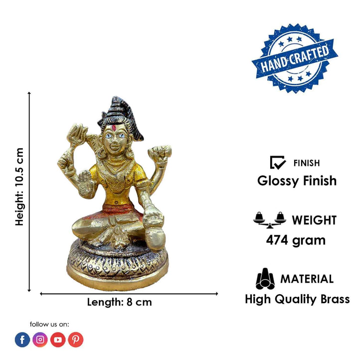 About Product: The 4 Inch Brass Chaturbhuj Shiva Ji Idol is a meticulously crafted brass statue depicting Lord Shiva in his four-armed (Chaturbhuj) form. This beautiful idol showcases Lord Shiva's divine power and grace, with intricate details highlighting his serene expression and flowing hair. Each hand holds symbolic objects such as the trident, drum, or a gesture of blessings, representing his cosmic abilities. The golden shine and fine craftsmanship of the idol make it a perfect addition to any home or temple, bringing peace, positivity, and spiritual energy to your space. With its compact size, this 4-inch statue is ideal for small altars or personal devotion.