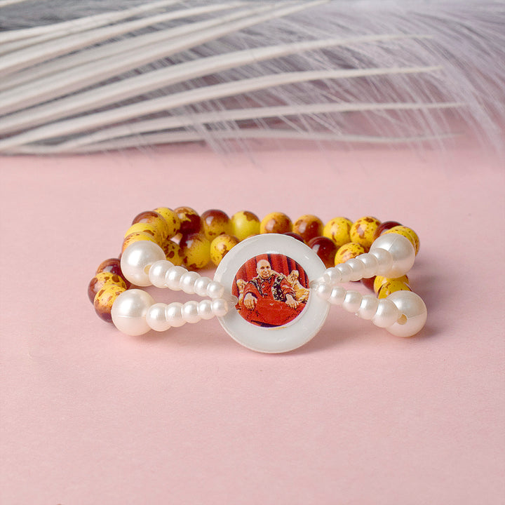 Crystal Yellow Printed Beads Double Layer & White Pearl Bracelet with Jai Guruji Swaroop