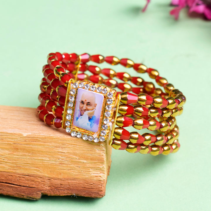 Jai Guruji Swaroop Pearl Bracelet adorned with Crystal Red Beads.