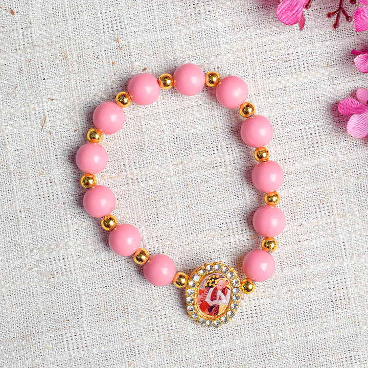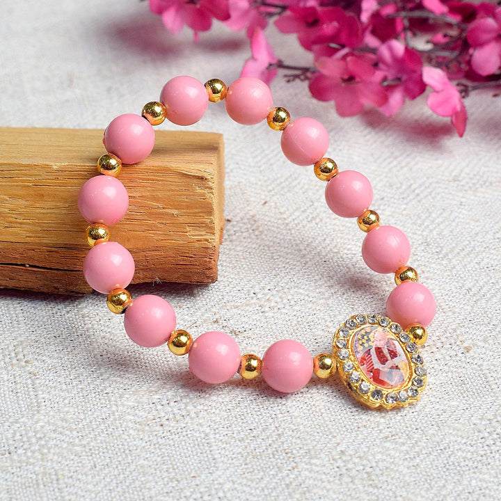 Pink Round Pearl Bracelet with Jai Guruji Swaroop Handmade Bracelets f – Satvikworld.com