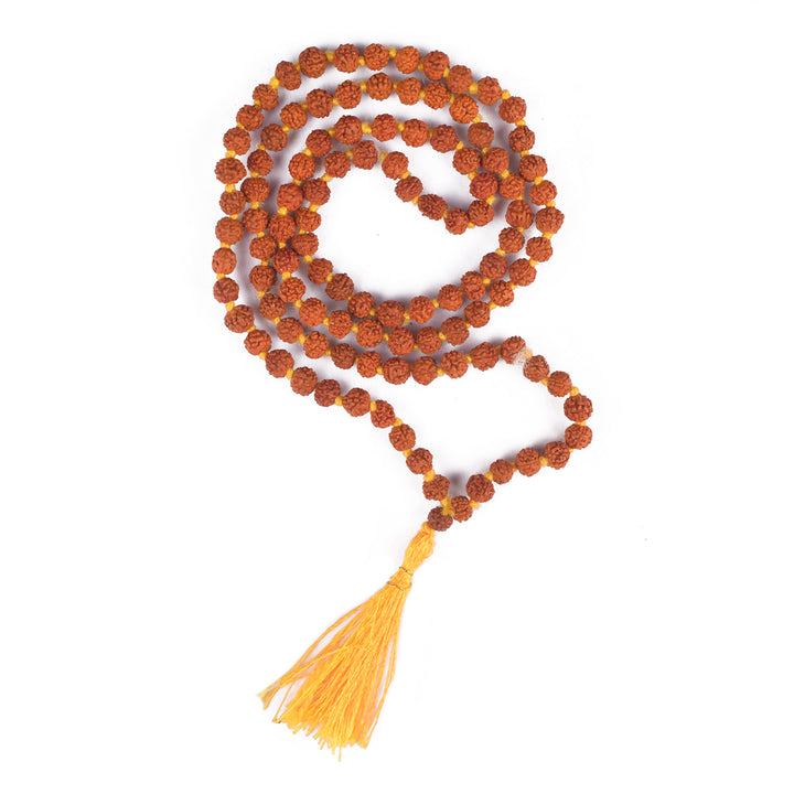 • Material : Made from High Quality Panchmukhi Rudraksha Beads to maintain the purity of Jaap Mala The beads is woven in Red Cotton Thread, A colored Fringe is also joint in the Mala.