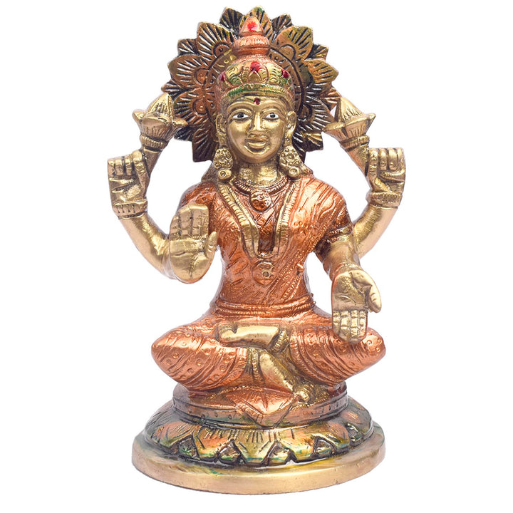 • Lakshmi, the Goddess of wealth, prosperity, and fortune, is typically depicted with her graceful and serene posture, holding lotus flowers and gold coins, symbolizing abundance and blessings.