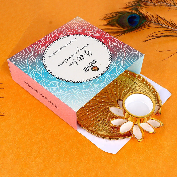 - Traditional and timeless, with diya, bell, incense holder, and roli chawal katori.