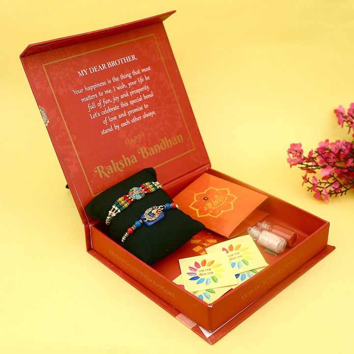 • Package: Set of 2 Bhaiya Rakhi, 1 Greeting card, 1 Roli Chawal Bottle, 1 Designer Gift Box