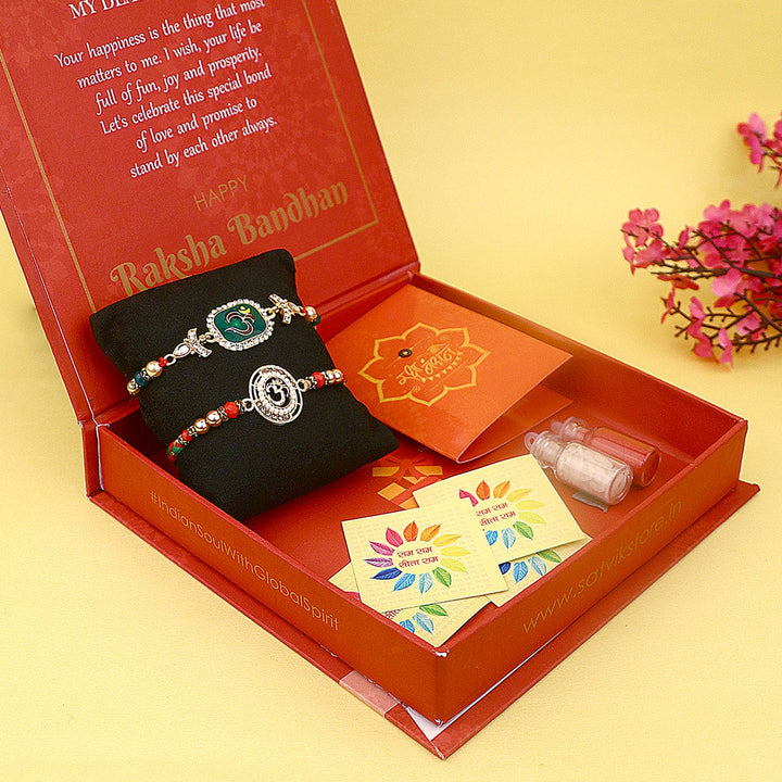 • Package: Set of 2 Bhaiya Rakhi, 1 Greeting card, 1 Roli Chawal Bottle, 1 Designer Gift Box