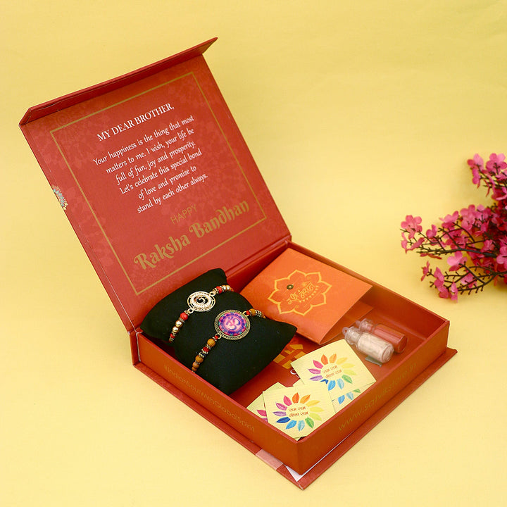 • Package: Set of 2 Bhaiya Rakhi, 1 Greeting card, 1 Roli Chawal Bottle, 1 Designer Gift Box