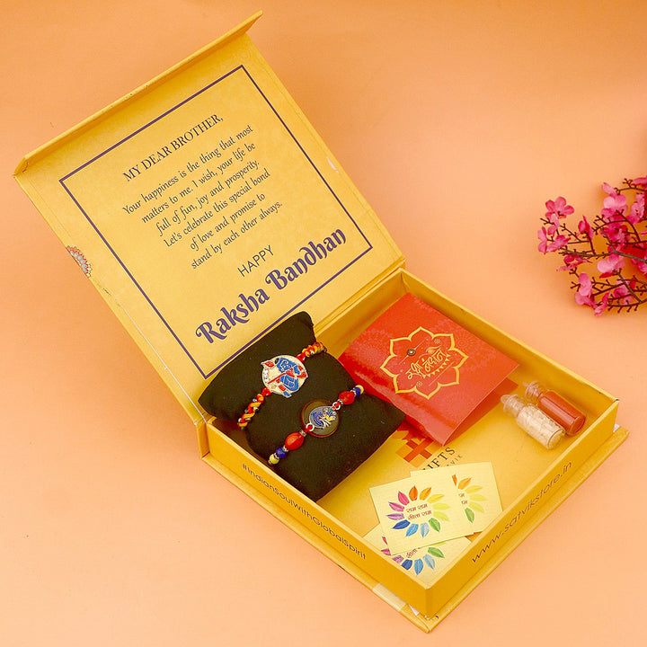 • Package: Set of 2 Bhaiya Rakhi, 1 Greeting card, 1 Roli Chawal Bottle, 1 Designer Gift Box
