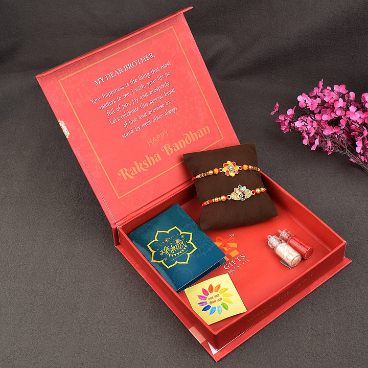 • Package: Set of 2 Bhaiya Rakhi, 1 Greeting card, 1 Roli Chawal Bottle, 1 Designer Gift Box