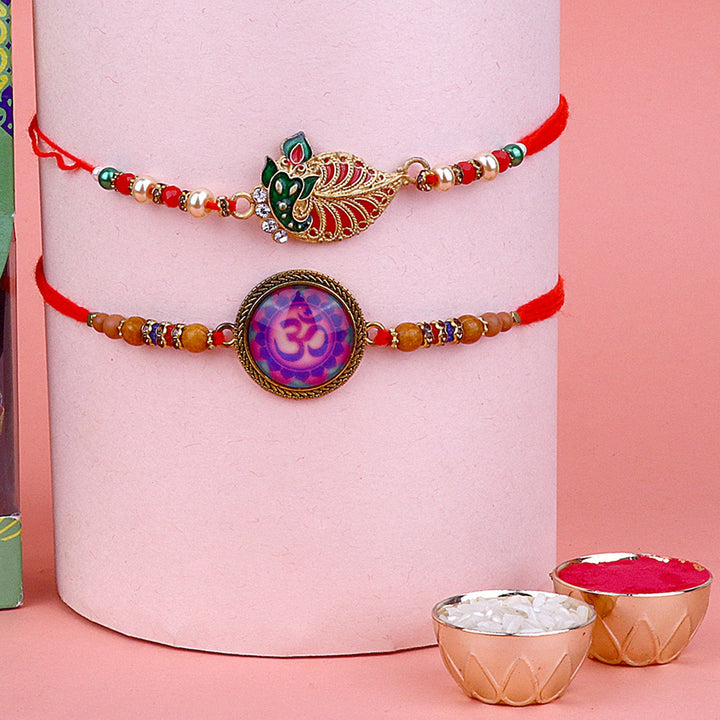 • Package: Set of 2 Bhaiya Rakhi, 1 Greeting card, 1 Roli Chawal Bottle, 1 Chocolate Pack