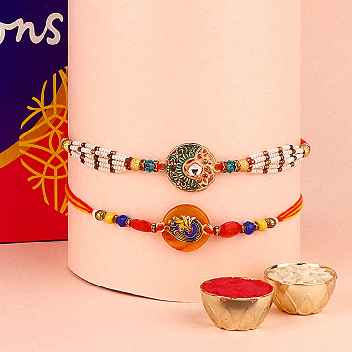 • Package: Set of 2 Bhaiya Rakhi, 1 Greeting card, 1 Roli Chawal Bottle, 1 Chocolate Pack