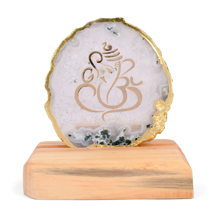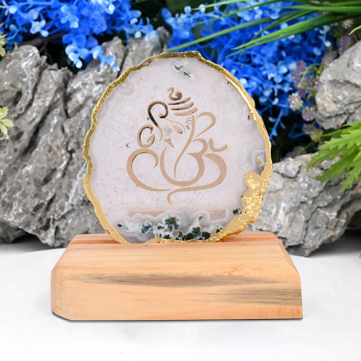 Agate Ganesha stand | Spiritual Ganesha decor | Hand-painted Ganesha stone | Ganesha on agate slice | Ganesha table stand | Agate spiritual showpiece | Wooden base Ganesha art | Religious agate display |