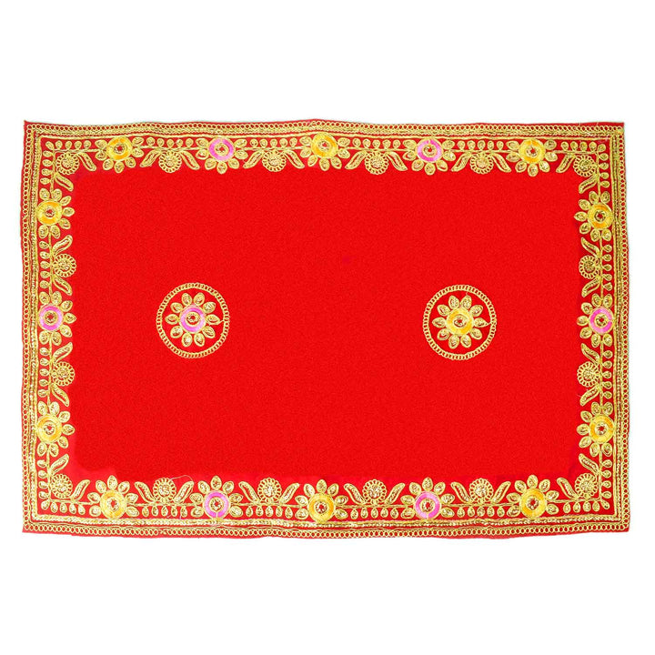 About Product: The Flower Designer Aasan set includes 4 beautifully crafted velvet mats, each measuring 16x24 inches. These aasans feature intricate flower designs and are enhanced with Golden Lace all over the Border, making them an ideal addition to your puja space. Their premium velvet material provides a smooth surface for placing idols, kalash, or other sacred items during prayers. Perfect for creating a divine aura in your home mandir, temple, or during religious ceremonies, these flower design aasans bring both elegance and spiritual harmony to any setting.