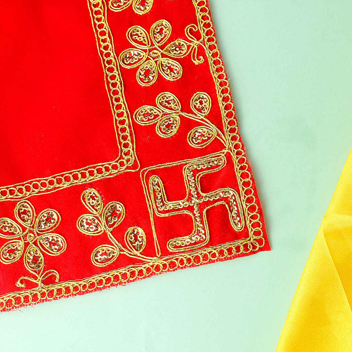 Heavy Design Aasan | Velvet Pooja Mat Set | Designer Puja Aasan | Aasan 15x23 Pack of 4 | Chowki Cover Cloth | Temple Cloth Set | Puja Aasan Velvet | Decorative Mandir Aasan | Red Velvet Asan with Lace | Religious Mat for Temple