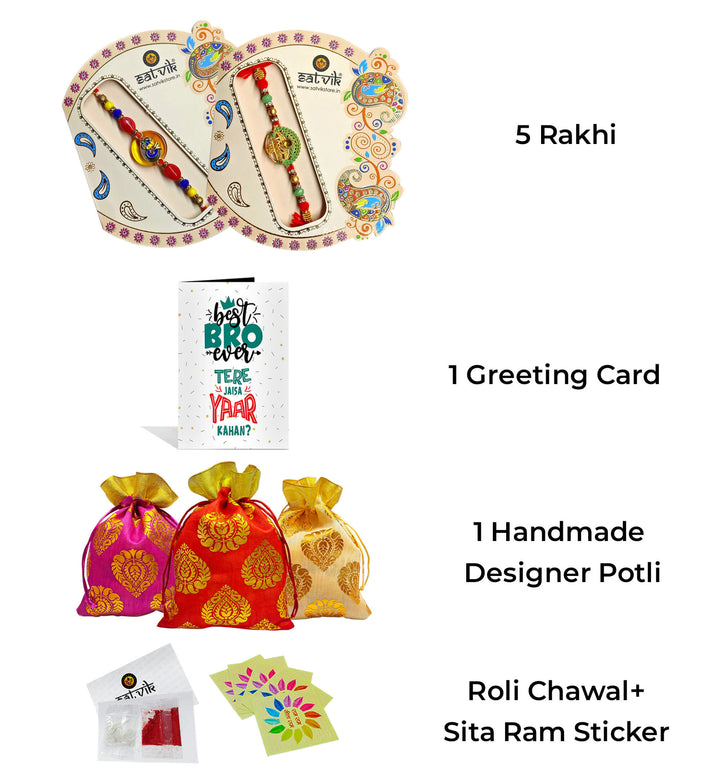 • Package: Set of 2 Rakhi with Tilak set ( Roli Chawal ) and Holy Soun ( Ram Sita Stickers)
