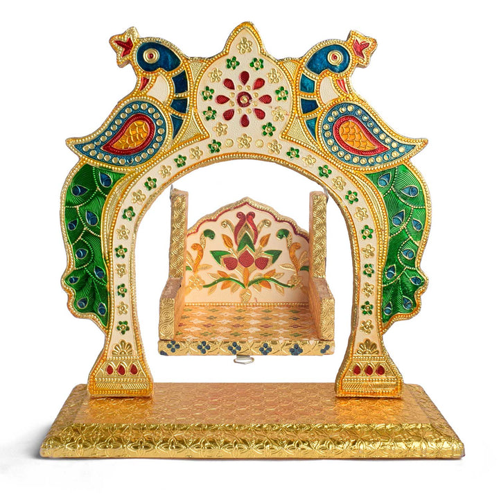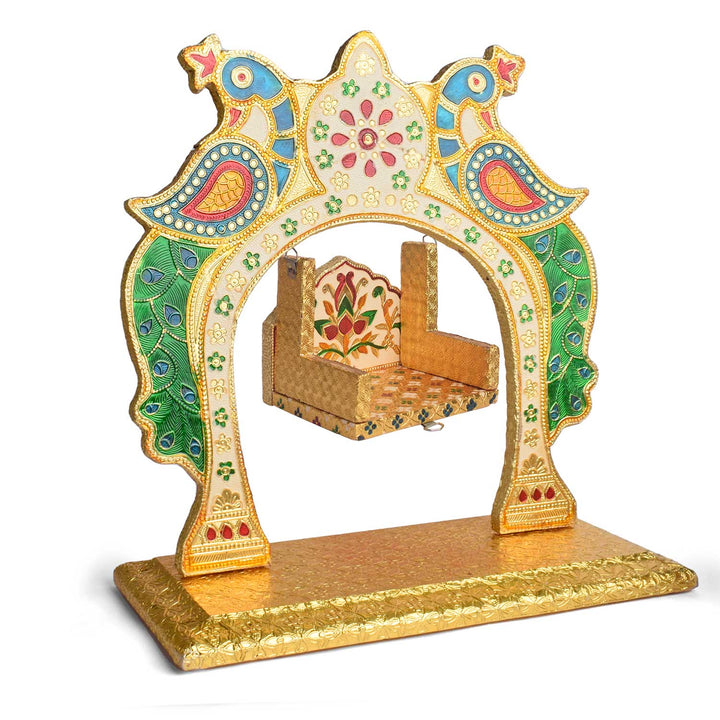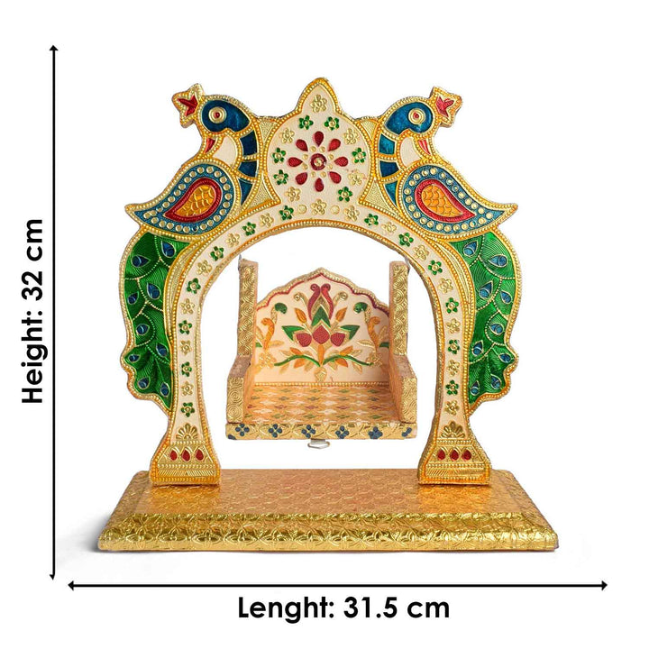 meenakari laddu gopal jhula | golden peacock krishna jhula | temple top swing for laddu gopal | big size krishna swing | pooja mandir jhula | satvikstore meenakari swing | gold tone kanha ji jhula | metal enamel swing for krishna | laddu gopal seat